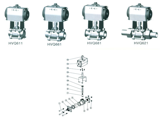 气动三片式内螺纹、焊接、卡箍、接管焊接球阀(阀座F、N、P)压力PN16-64