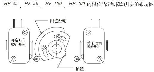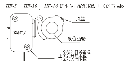 送开限位凸轮的顶丝,使其轻轻转动,从而调整凸轮角度来改变微动开关的制动位置。确定位置后,紧固凸轮的顶丝,调整完毕。