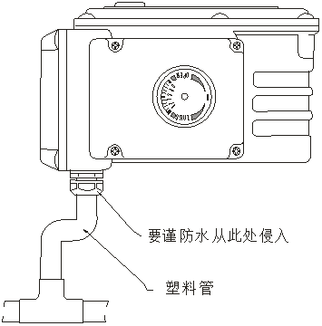 如图所示,阀门执行器安装位置应高于电缆管的位置,确保水珠不会沿电缆流入执行器中。